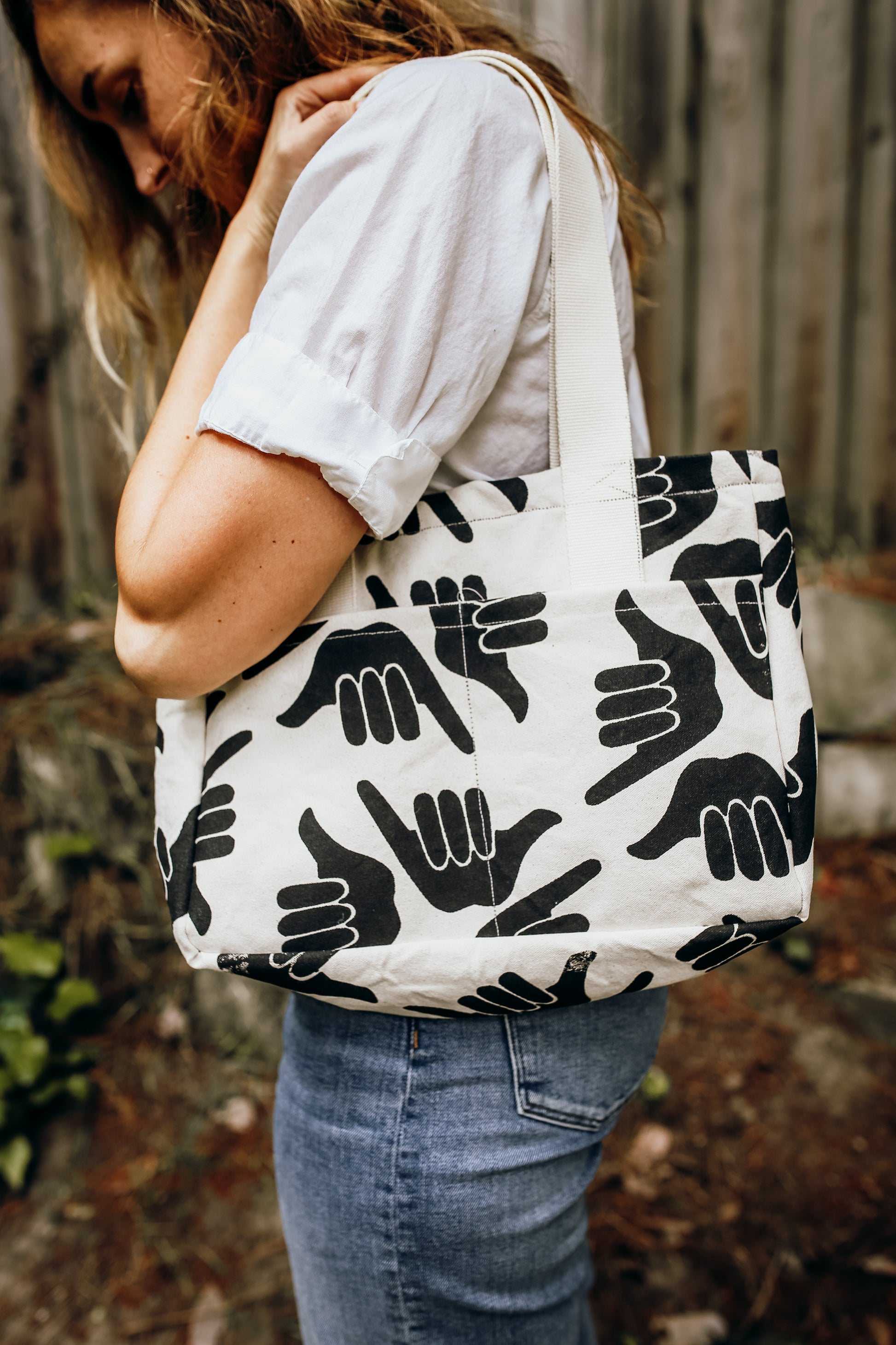 shaka- When I first started thinking I should start printing my own fabric for my bags this was the first print that came to mind. The shaka is the most recognizable symbol of surf culture and the meaning behind it is the embodiment of a life lived well. Hang loose, friends.